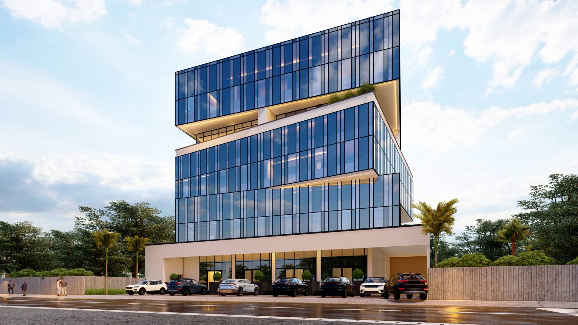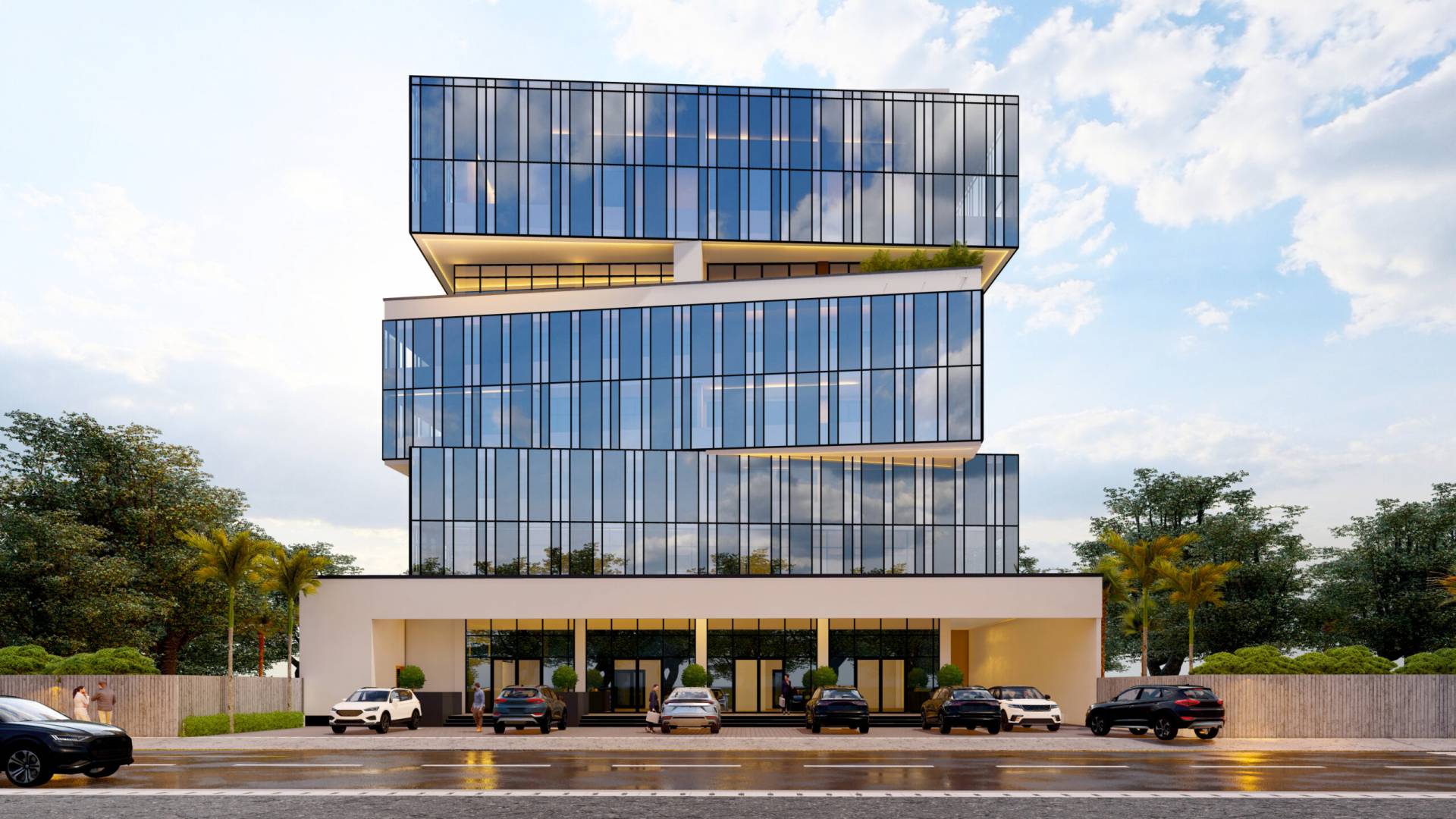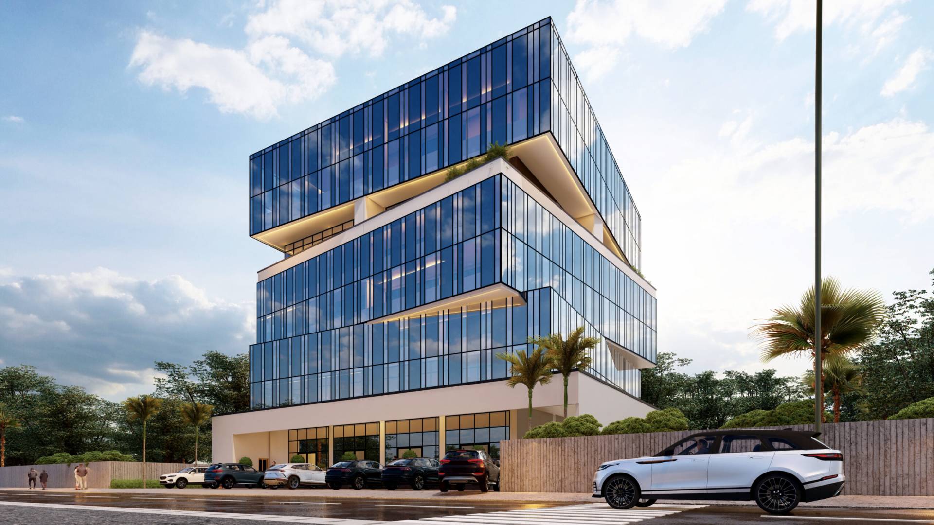 Le projet Cube Affaires réinterprète la rigueur géométrique du cube pour en faire un objet architectural dynamique et poreux. L’édifice se définit par une superposition de volumes vitrés dont les légers décalages (glissements) rompent la monotonie de la façade rideau traditionnelle. Cette déconstruction volumétrique permet l’insertion d’une large faille horizontale végétalisée en coeur de bâtiment, offrant un espace de respiration et de bien-être pour les collaborateurs. Le socle blanc, massif et épuré, souligne par contraste la légèreté et la transparence des étages supérieurs, faisant de ce centre d’affaires un nouveau signal urbain, à la fois institutionnel et tourné vers l’avenir.