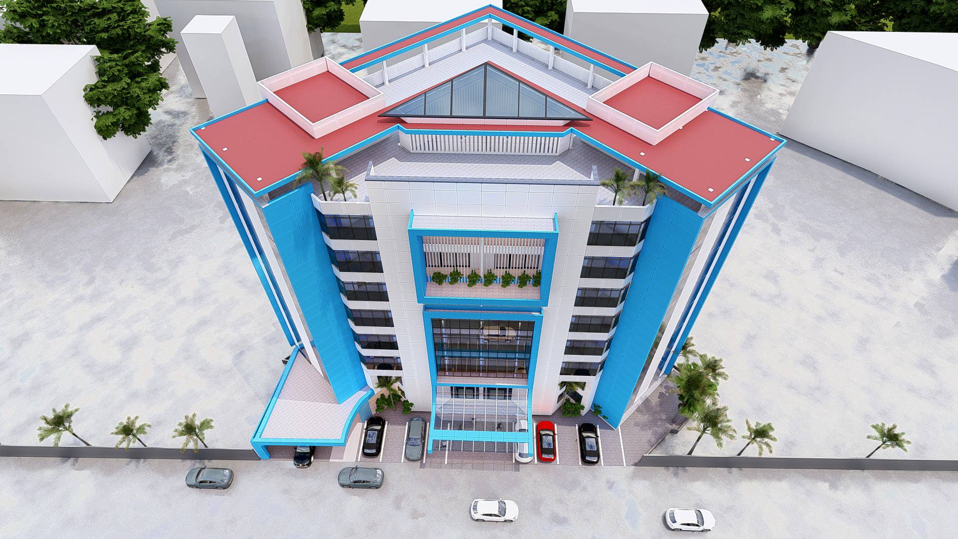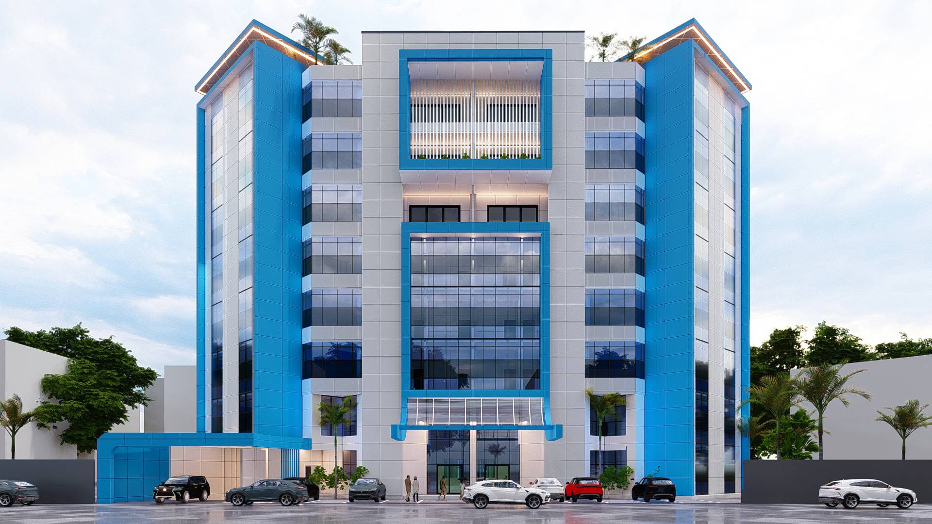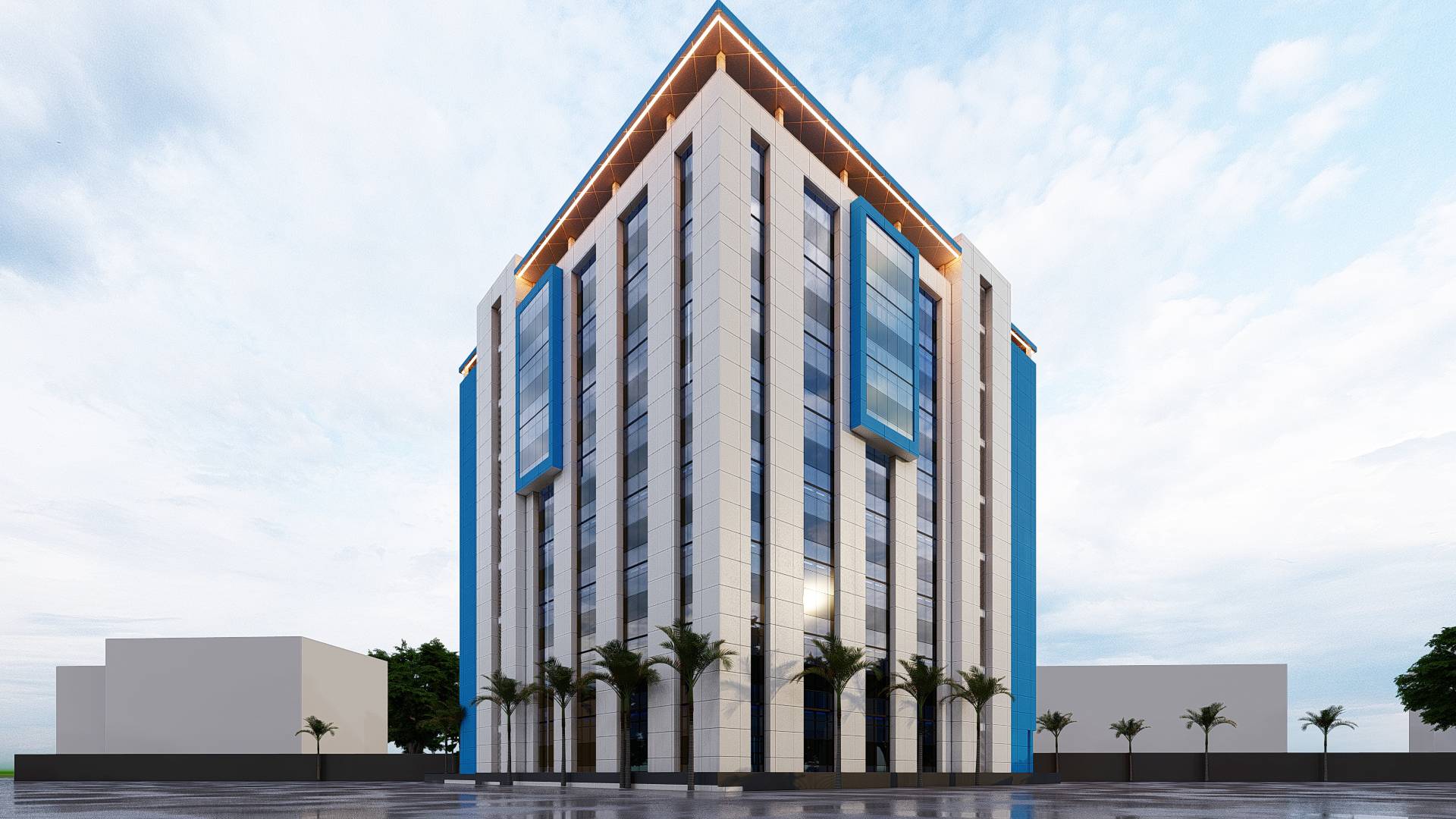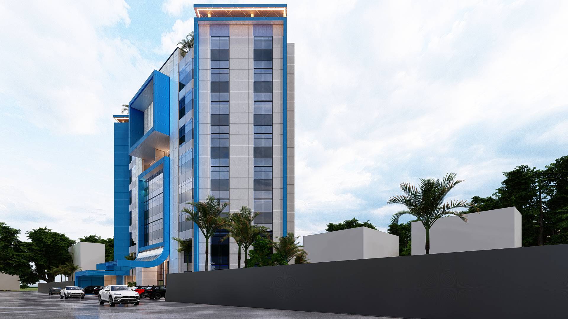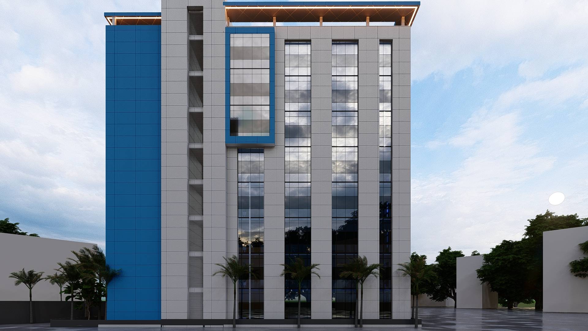Ce siège d’assurance résolument moderne, arbore les couleurs emblématiques de l’entreprise : le blanc et le bleu. De vastes baies vitrées inondent l’intérieur de lumière naturelle, tandis que le revêtement en alucobond confère à la façade une esthétique épurée et contemporaine. L’entrée visiblement signalée par un porche, invite à la découverte d’un espace conçu pour la transparence et la confiance. A l’avant, un espace de parking pratique facilite l’accès pour les clients et le personnel. Ce bâtiment incarne l’harmonie entre modernité et fonctionnalité, tout en reflétant les valeurs de confiance et de professionnalisme de l’assurance