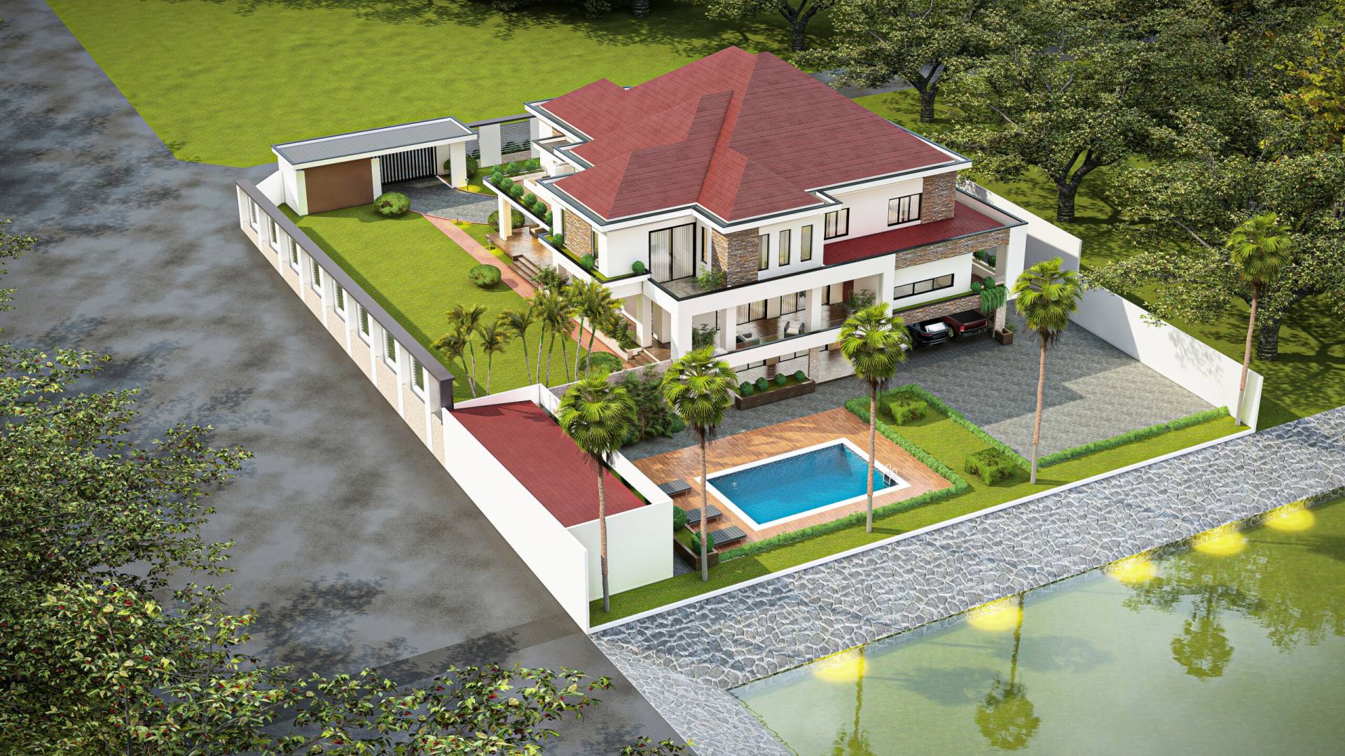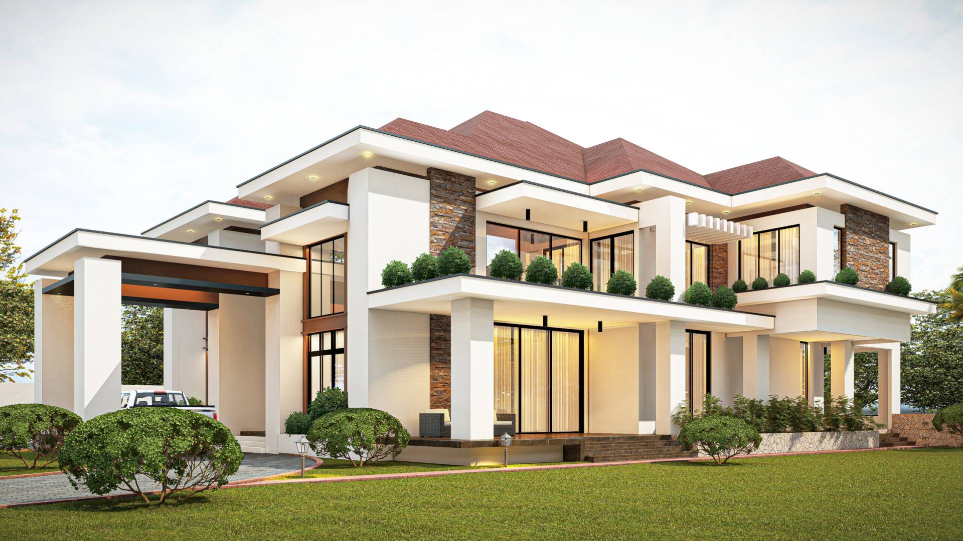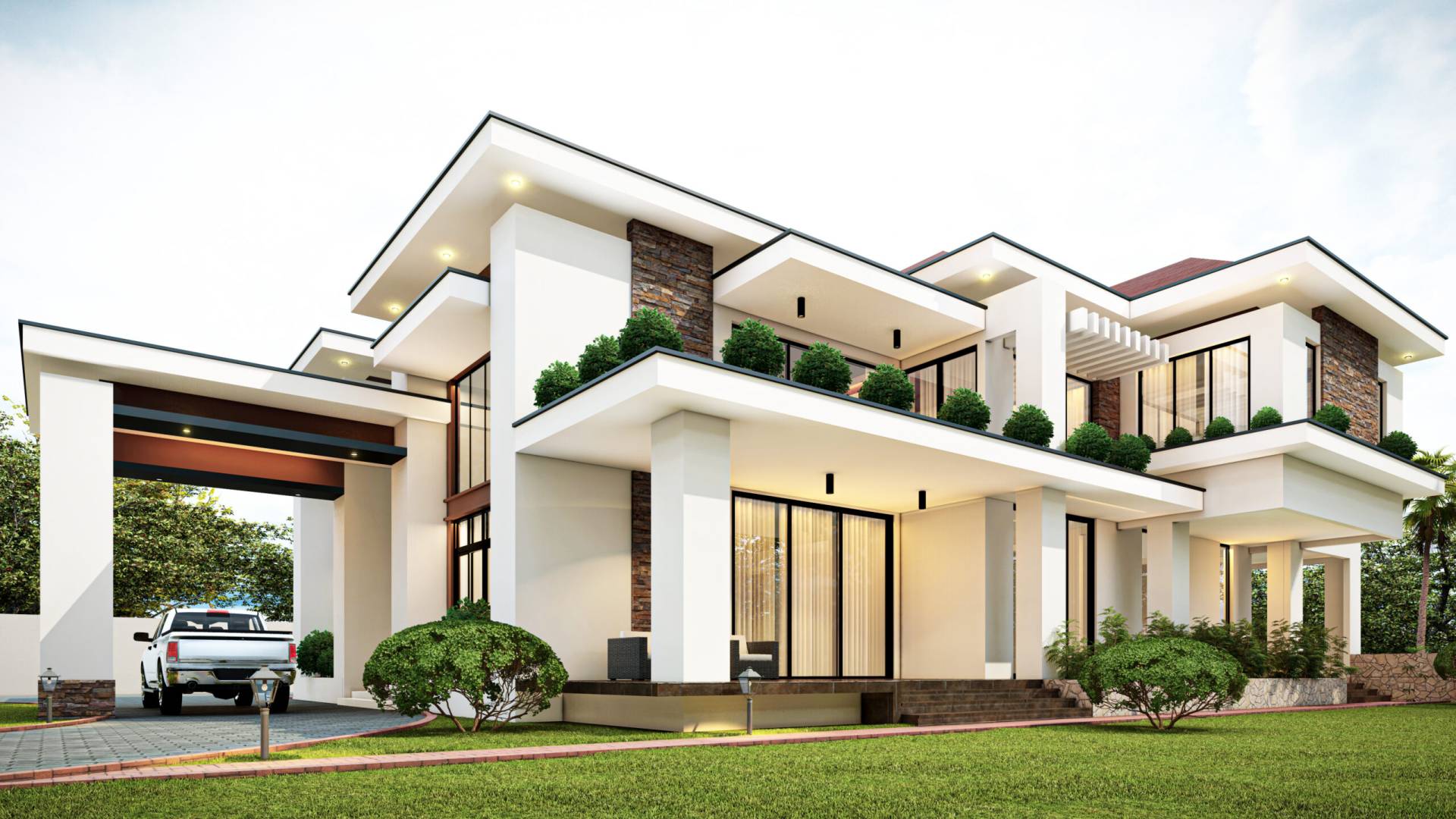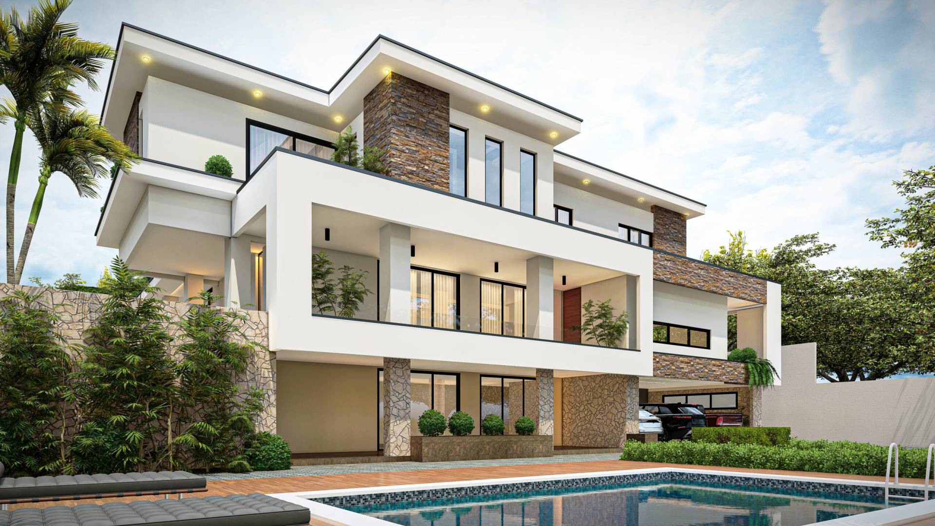 Cette villa contemporaine se déploie à travers un jeu de dalles horizontale en porte-à-faux, créant un rythme dynamique et des zones d’ombrages naturelles. Entre ses terrasses en cascade et ses parements de pierre naturelle, la Villa Strata est une invitation à vivre en harmonie avec le paysage. Le contraste entre la blancheur immaculée des structures et la chaleur de la toiture a pentes multiples apporte une touche de classicisme répétée. L’intégration de la végétation directement sur les balcons souligne la volonté de créer un habitat respirant, ouvert sur un jardin paysager généreux. Une villa d’exception conçue pour ceux qui exigent une architecture a la fois monumentale et intimiste.