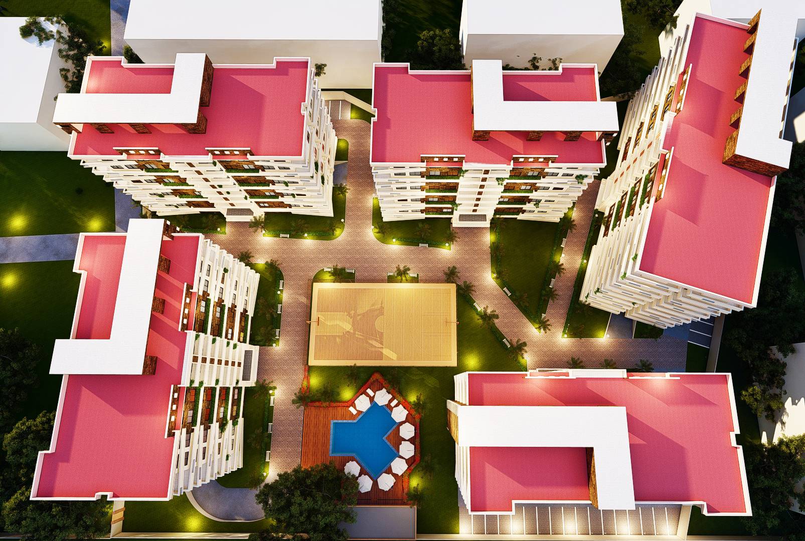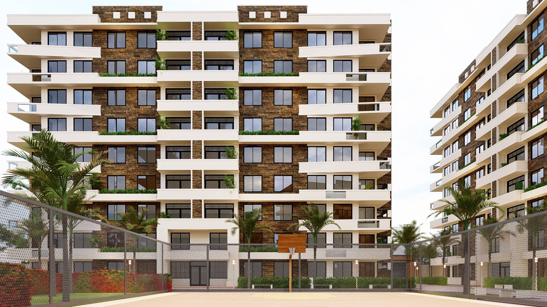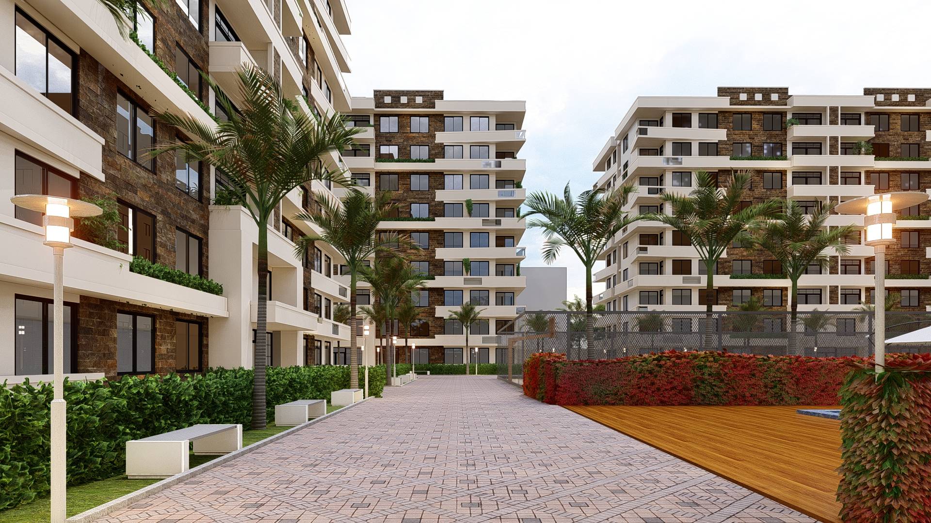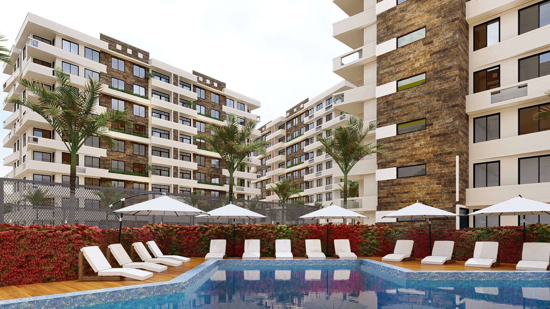 Ce projet ambitieux propose un complexe immobilier moderne, composé de cinq bâtiments R+9 identiques, caractérisés par des façades rythmées par de larges fenêtres vitrées et rehaussées par des revêtements de pierre élégants. L’ensemble est complété par une piscine rafraichissante, des espaces verts paysagés invitant à la détente, et des zones de stationnement pensées pour le confort des résidents, créant ainsi un cadre de vie harmonieux et fonctionnel